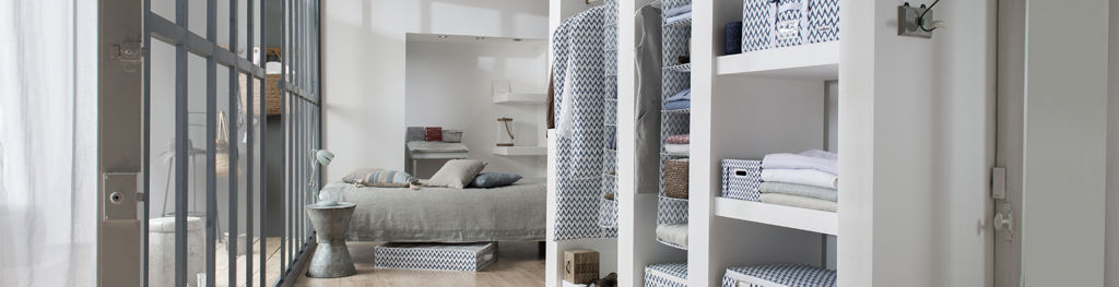 Passend zum Dekortrend ist die Kollektion Compactor Ikat von traditionellen asiatischen Stoffen inspiriert und organisiert Ihren Ankleideraum auf eine hübsche und exotische Art und Weise. Verwenden Sie dieses auffällige Design, das auf Aufbewahrungstaschen, Schachteln und flexible Regale übertragen wurde, um Ihre Kleidung zu schützen und Ihrem Zuhause eine raffinierte Note zu verleihen.