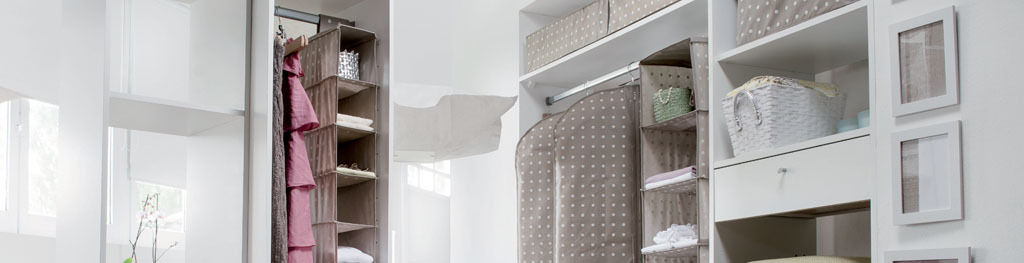 Ein weißes Tupfen Muster auf taupefarbenem Hintergrund macht die Rivoli-Kollektion sehr ansprechend. Eine schöne Möglichkeit, Ihr Ankleidezimmer und Ihr Schlafzimmer mit einem perfekt abgestimmten Sortiment zu organisieren. Compactor Taschen, flexible Ablagen und Schubladenunterteilungen lassen sich mit Haken, Kisten und Körben kombinieren, um Kleidung und Haushaltswäsche intelligent zu ordnen und zu schützen.